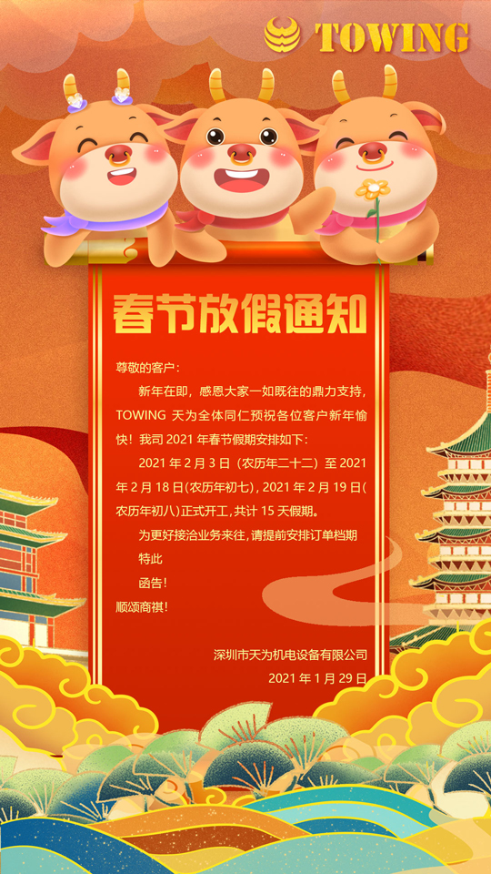 新年在即,感恩大家一如既往的鼎力支持,TOWING天為全體同仁預祝各位客戶新年愉快!我司2021年春節假期安排如下: